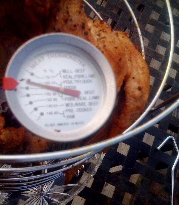 Place the giblets and neck in the bottom of the wire basket and arrange the bird legs down and breast up in the basket. Place the (supplied meat thermometer) in the thickest portion of the breast, insure the tip is not touching any bone, or else you will get a false reading.